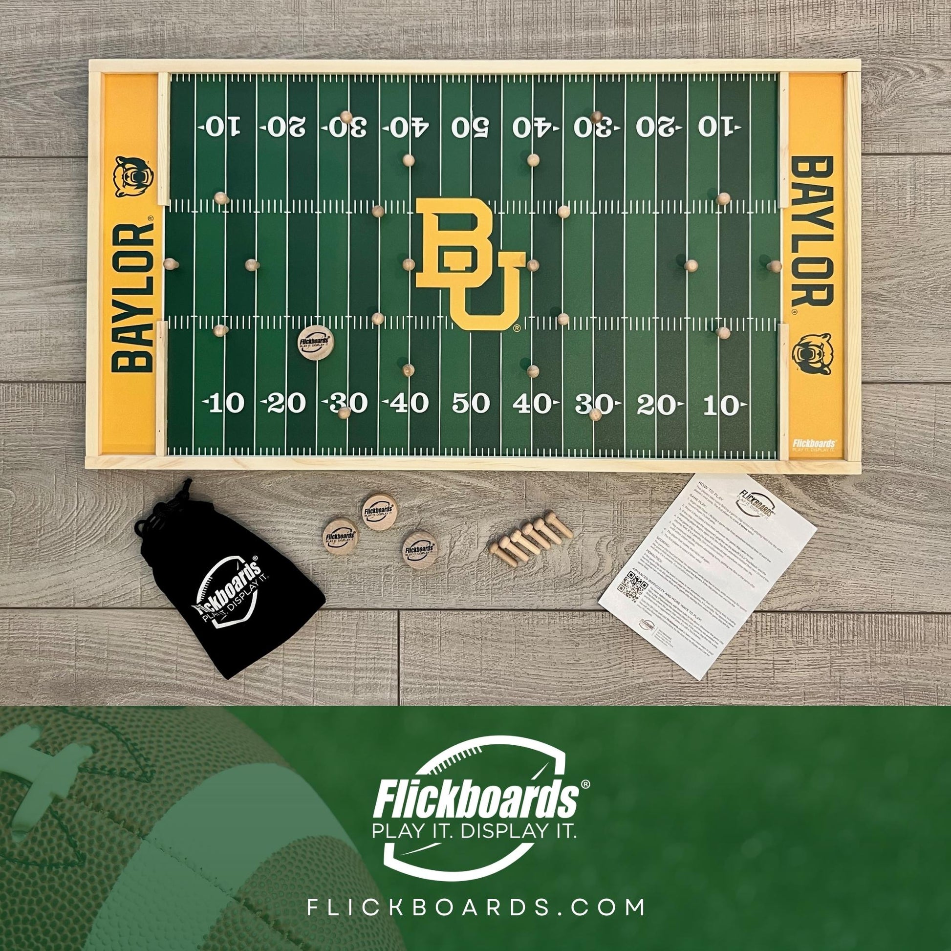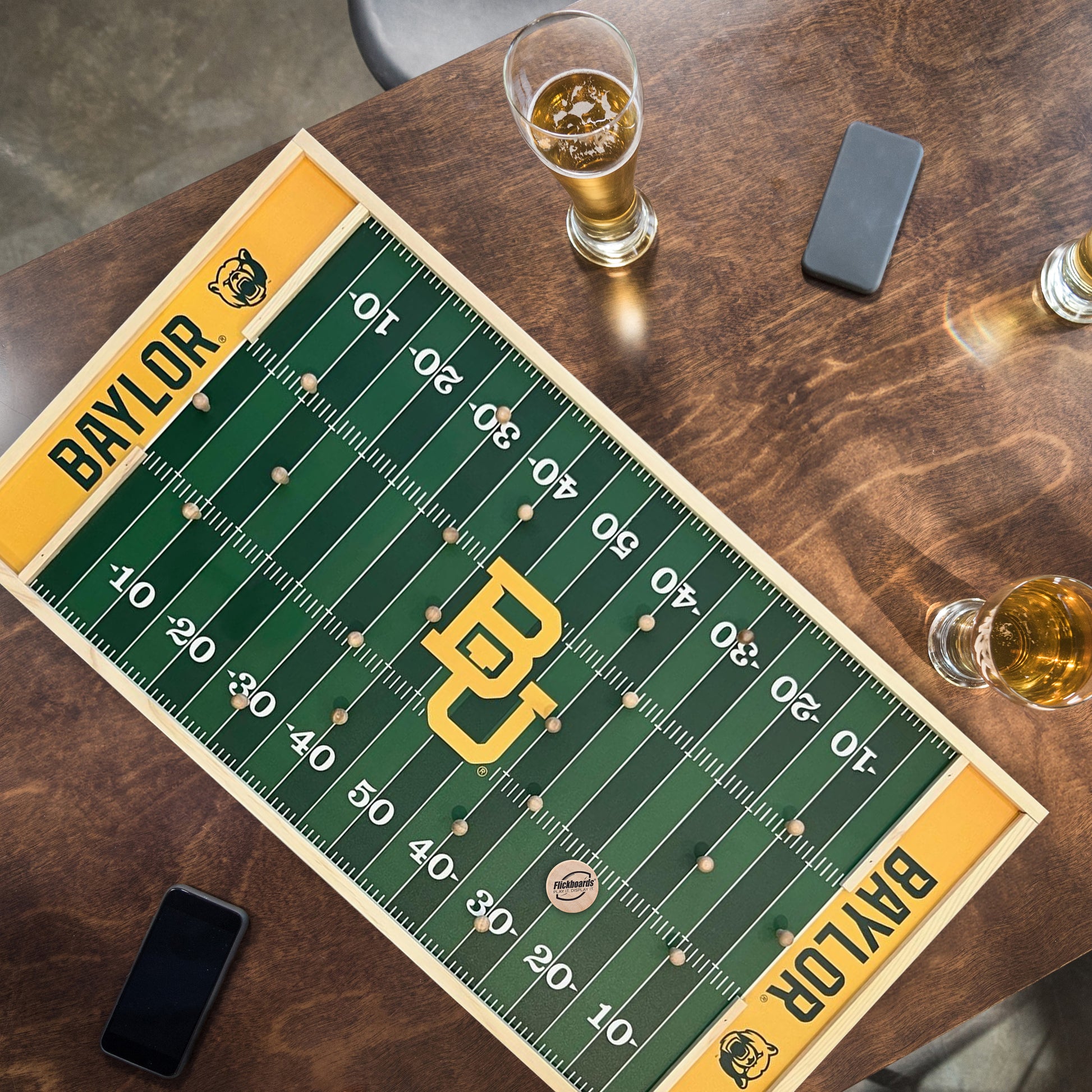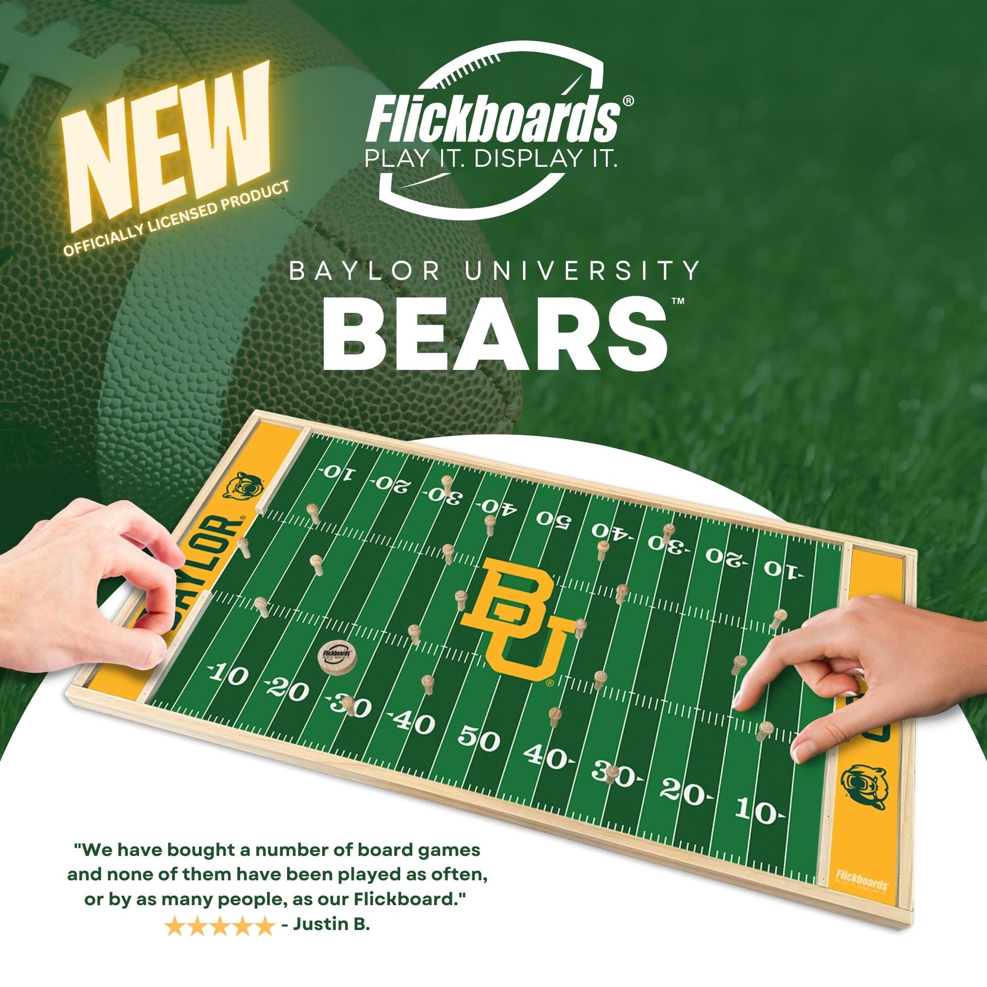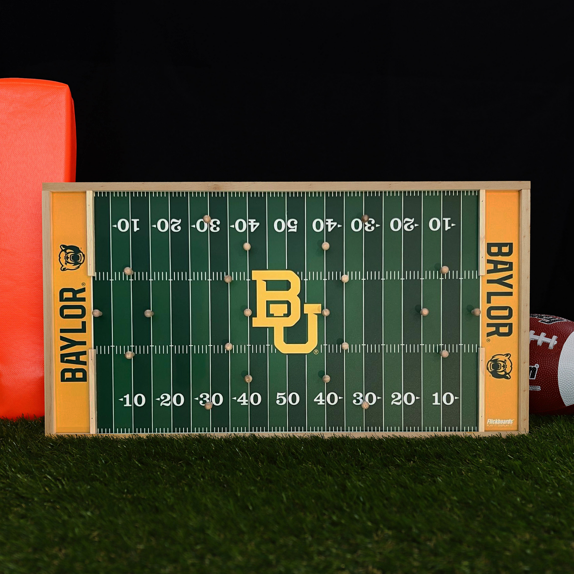 Introducing the officially licensed Baylor Bears Football Flickboard - perfect for fans of all ages! This 2-player game is reminiscent of paper football, with wooden chips flicked down the board to score touchdowns.