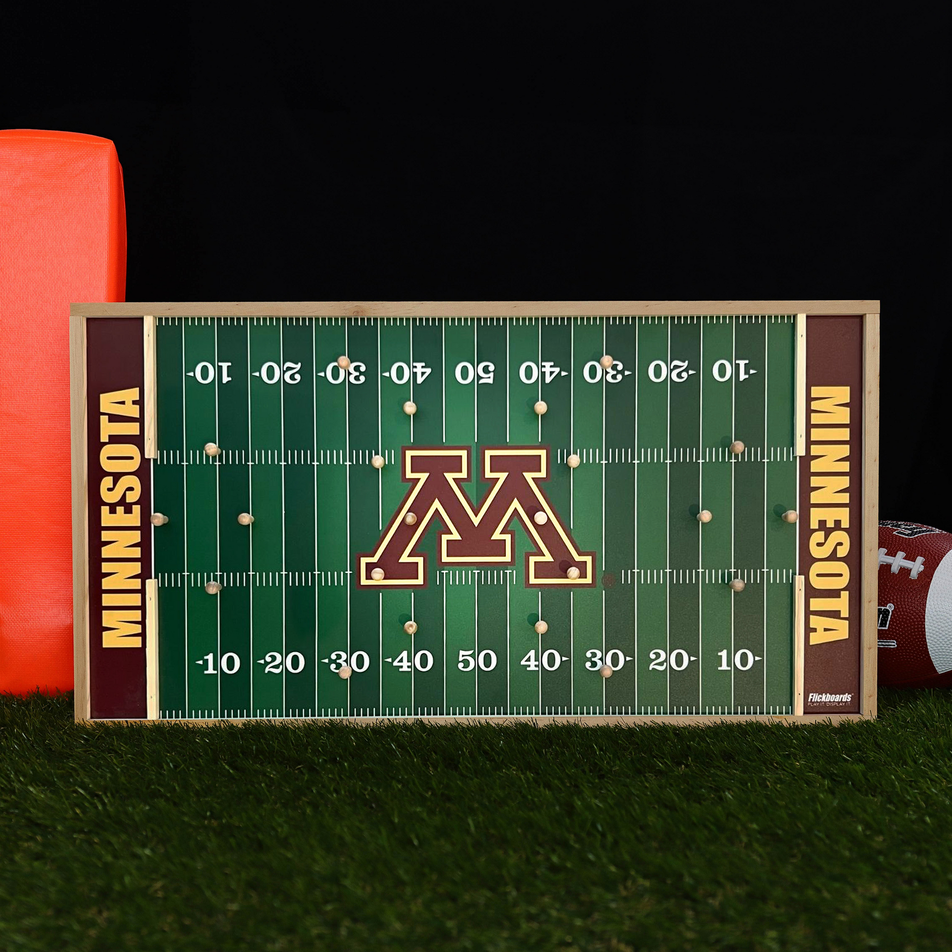 Introducing the officially licensed Minnesota Golden Gophers Football Flickboard - perfect for fans of all ages! This 2-player game is reminiscent of paper football, with wooden chips flicked down the board to score touchdowns.