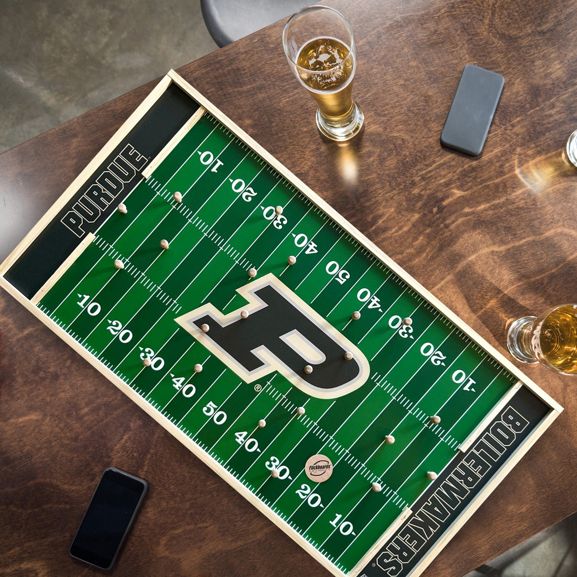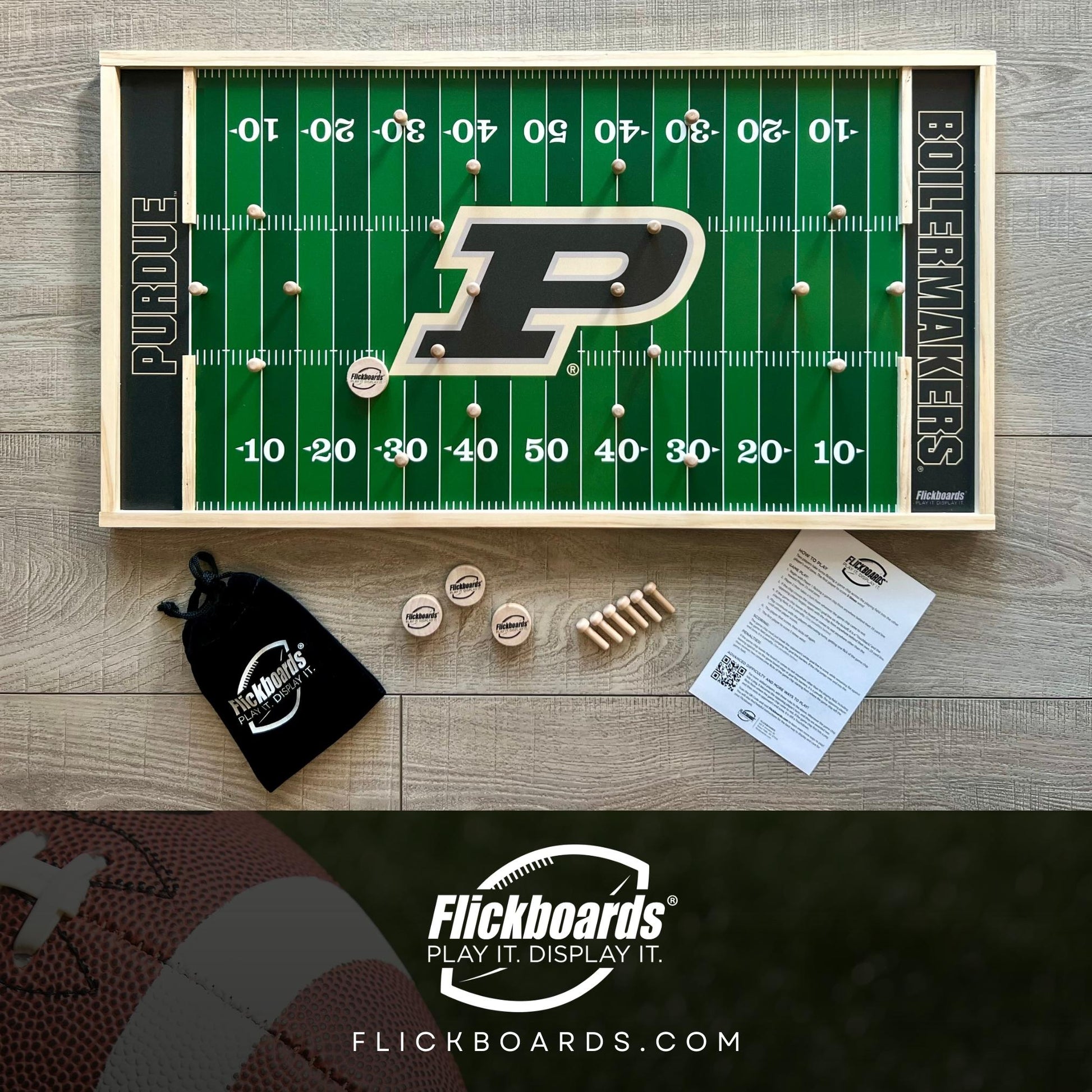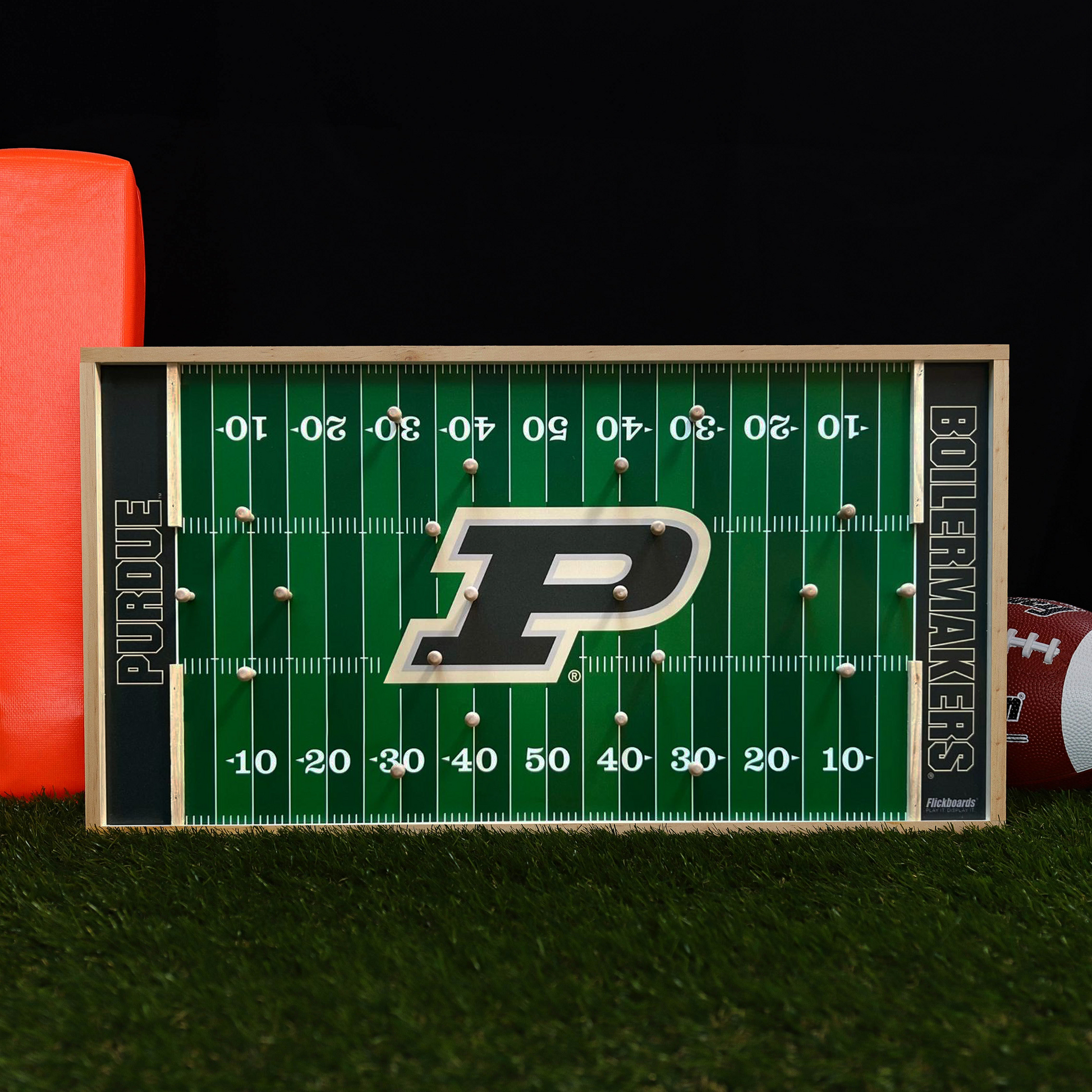 Introducing the officially licensed Purdue Boilermakers Football Flickboard - perfect for fans of all ages! This 2-player game is reminiscent of paper football, with wooden chips flicked down the board to score touchdowns.