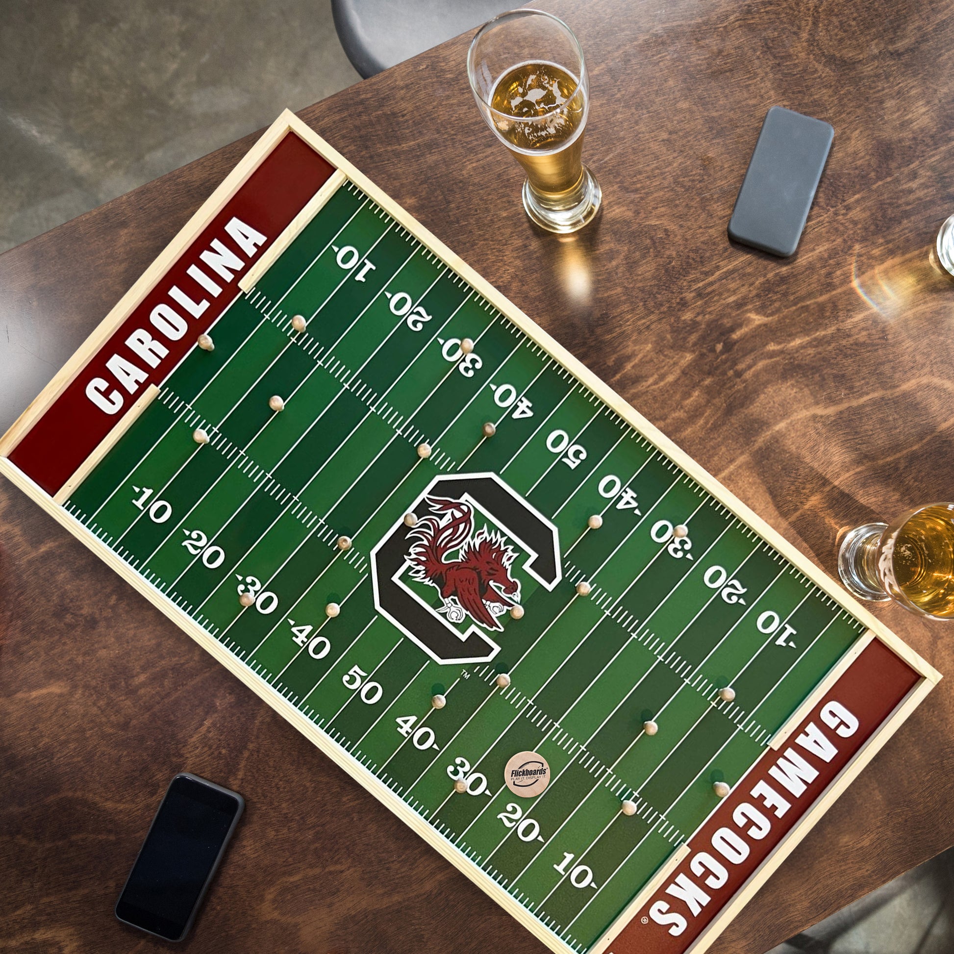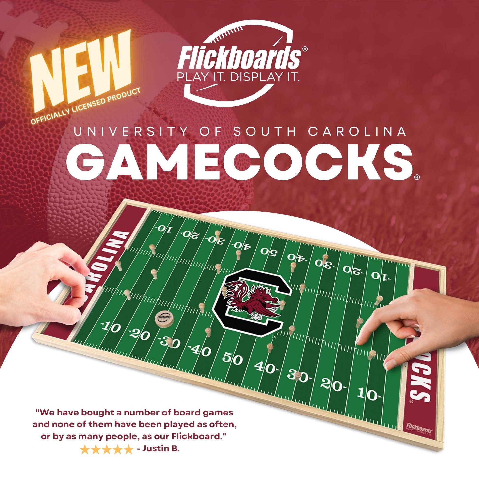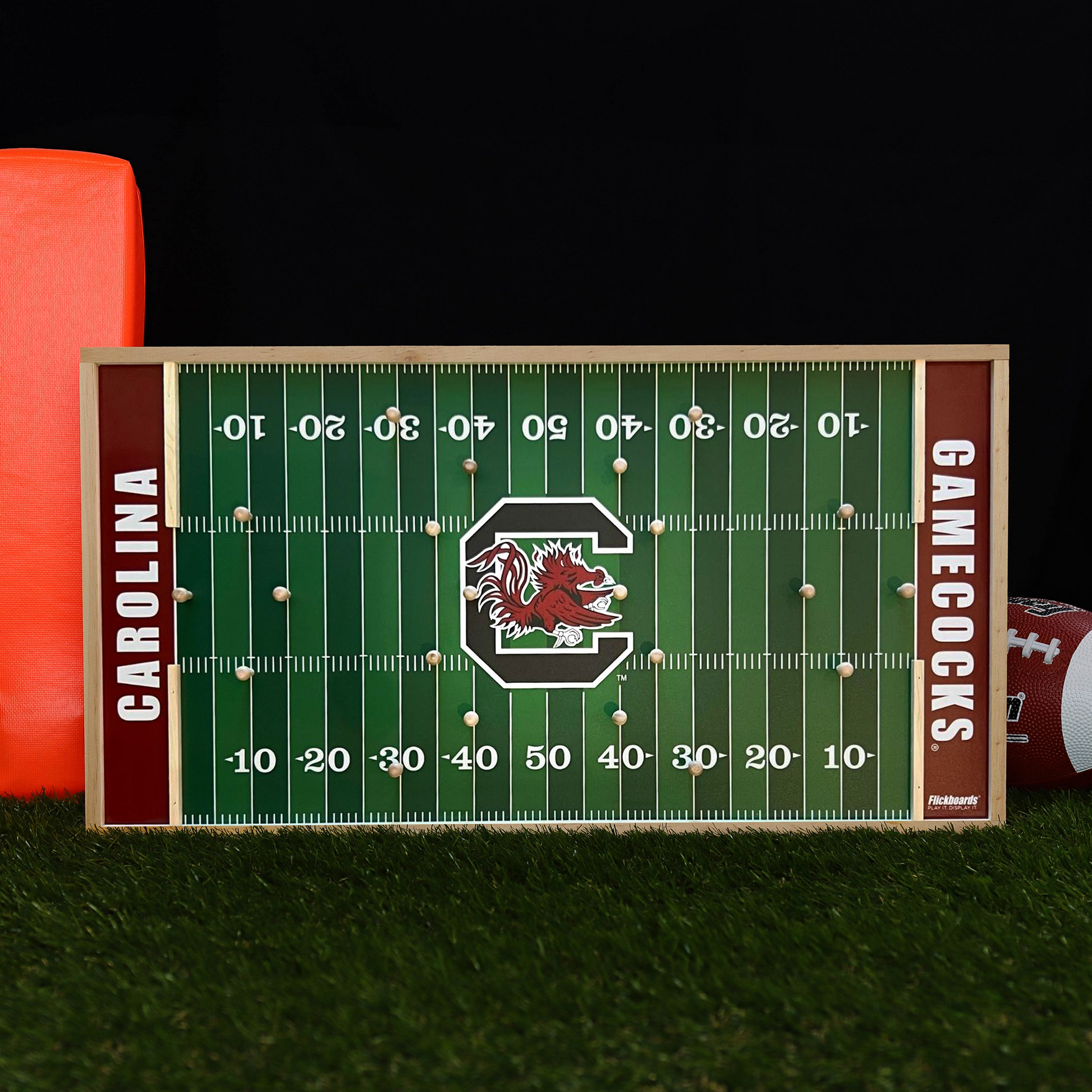 Introducing the officially licensed South Carolina Gamecocks Football Flickboard - perfect for fans of all ages! This 2-player game is reminiscent of paper football, with wooden chips flicked down the board to score touchdowns.